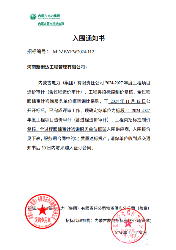 近日,我公司收到內(nèi)蒙古電力集團的入圍通知書,被確定為內(nèi)蒙古電力(集團)有限責(zé)任公司2024-2027年度工程項目造價審計(含過程造價審計)、工程類招標(biāo)控制價復(fù)核、全過程跟蹤審計咨詢服務(wù)單位框架入圍供應(yīng)商。